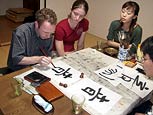Ralph presents his second (prepared) piano workshop at the Hirado elementary school, where also the children enjoy the unexpected sound transformations. In the afternoon Ralph does a similar workshop at the Houki elementary school. Nikkie finished the 'Nakatsura Tower' at the Nakatsura elementary school which she started yesterday. In the evening both Ralph and Nikkie have their first shodo (calligraphy) lesson with Tateishi-sensei (translation Rinako-san).